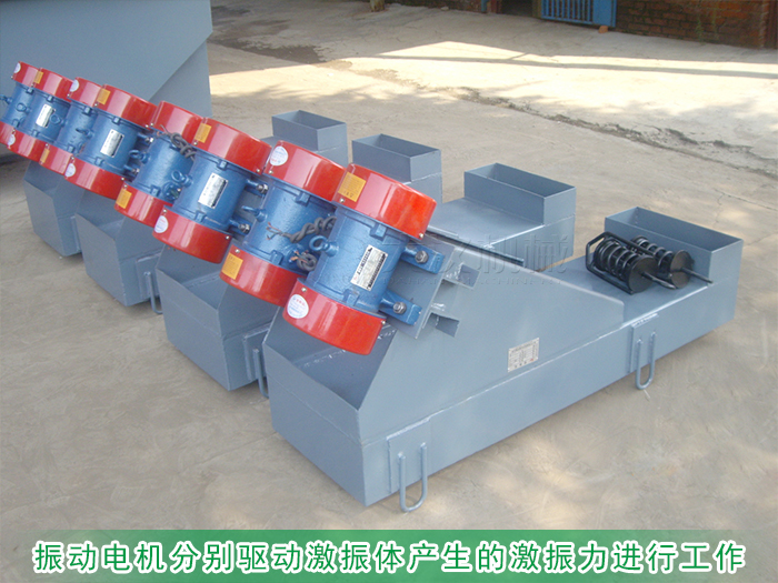 振動給煤機的振源,用於產生周期變化的激振力,使共振體產生持續的振動。激振器是此振動設備的關鍵部件,它產生激振力的大小直接影響著共振體的振幅,其交變頻率即為振動給煤機的工作頻率。常用的激振器有慣性式激振器、彈性連杆式激振器、電磁式激振器、液壓式或氣動式激振器,以及凸輪式激振器。本設備的激振器是凸輪式激振器,該凸輪式激振器是有一對可變力輪組成,激振器產生的激振力決定了共振體的振幅,而給煤機的出料量主要是由共振體的振幅決定的,使用可變力輪後,活化振動給煤機可以實現從0到100%無級調速。