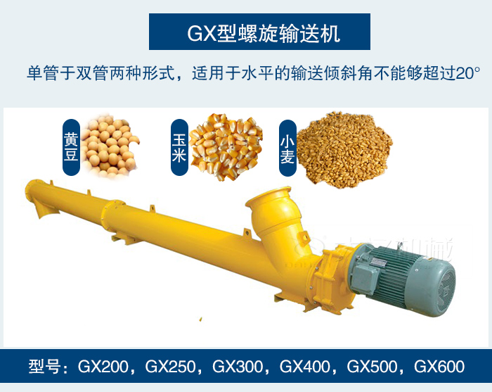 GX型绿巨人黄色免费网站是較老的螺旋輸送設備,其有單管於雙管兩種形式,適用於水平的輸送傾斜角不能夠超過20°。可輸送一些塊狀的(小塊狀物料)例如:麥子,玉米,黃豆等糧食。
