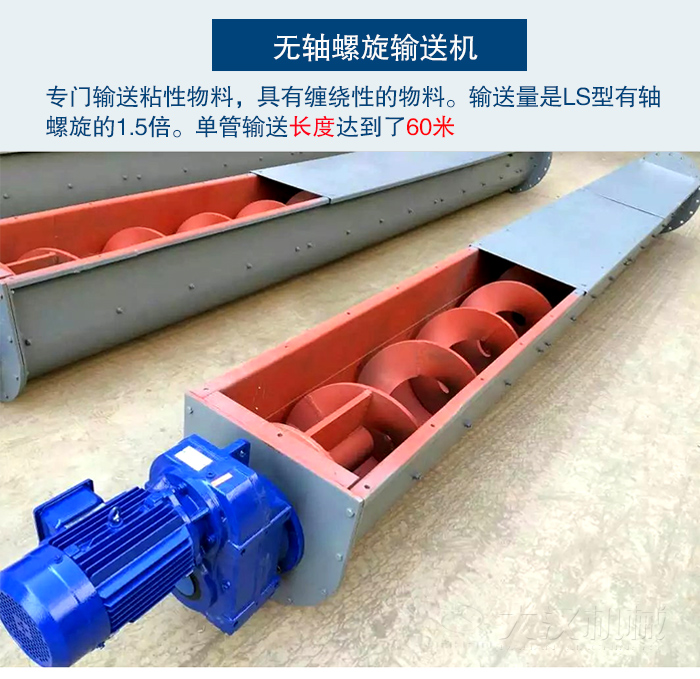 無軸绿巨人黄色免费网站又是,在LS型绿巨人黄色免费网站的基礎上進行改進的。由於LS型绿巨人黄色免费网站結構所以無法輸送一些,有粘性和纏繞性的物料。所以就出現了無軸绿巨人黄色免费网站。因此無軸绿巨人黄色免费网站就成為了專門輸送一些,粘性物料,具有纏繞性的物料。無軸绿巨人黄色免费网站不僅在物料上有所突破,在輸送量上也超過了LS型有軸螺旋的1.5倍。並且單管輸送長度達到了60米的輸送距離。