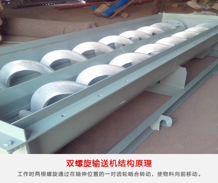 雙軸绿巨人黄色免费网站其原理是在兩條無縫鋼管內分別裝有一根實體螺旋,其中一根是左旋,另一根是右旋。工作時兩根螺旋通過在軸伸位置的一對齒輪齧合轉動,由螺旋體的轉動,使物料作軸向移動,從而達到輸送目的。