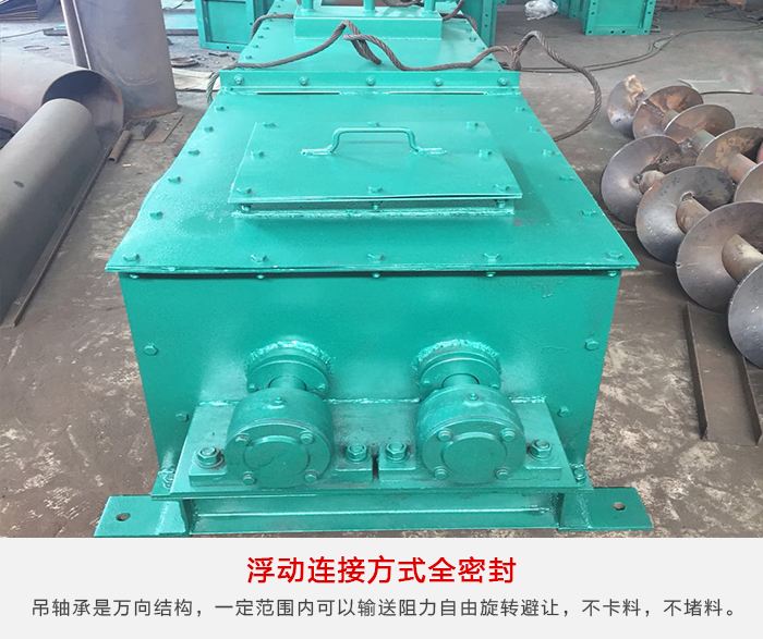 各傳動部位都是采用浮動連接方式,吊軸承是萬向結構,使吊軸承、螺旋體和尾部總能形成一個整體的旋浮體,在一定範圍內可以輸送阻力自由旋轉避讓,不卡料,不堵料。
