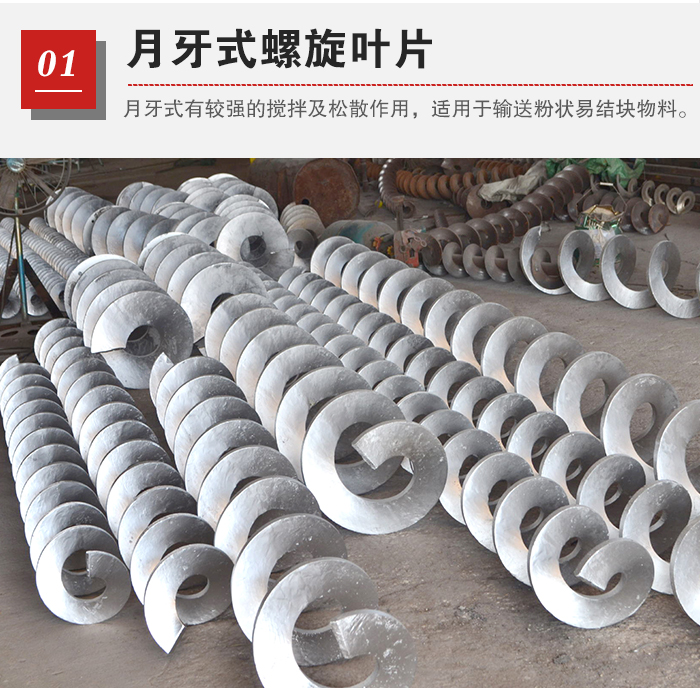 月牙式有較強的攪拌及鬆散作用,適用於輸送粉狀易結塊物料。