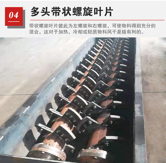 這種類型的螺旋由兩個或多個不同直徑的帶狀螺旋葉片構成,帶狀螺旋葉片彼此為左螺旋和右螺旋,一條葉片套在另一條內,通過剛性掛耳連接在同一根管子或軸上,一條帶狀葉片使物料向前移動,另一條帶狀葉片使物料向後移動,這樣可使物料而充分的混合。標準螺距鋸齒折角單頭螺旋 在螺旋外邊棱上切有鋸齒並折彎,這樣可使被移動的物料翻轉和灑落,使物料得到充分的混合,這對於加熱、冷卻或輕質物科風幹是極有利的。