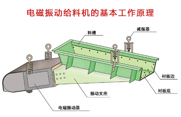 電磁振動給料機是一個較為完整的雙質點定向強迫振動的彈性係統, 整個係統工作在低臨界共振狀態,主要利用電磁激振器驅動槽體以一定的傾角做往複振動,使物料沿槽移動。為電磁振動給料機的工作原理。