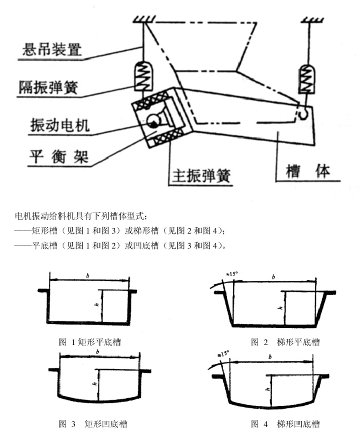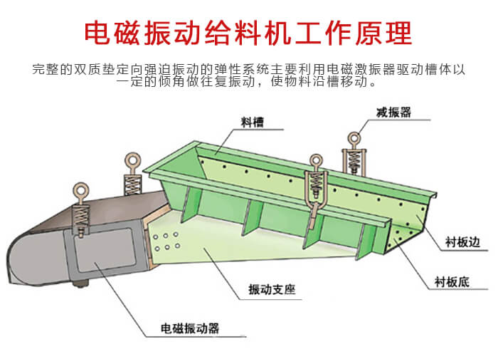 電磁振動給料機是一個較為完整的雙質墊定向強迫振動的彈性係統, 整個係統工作在低臨界共振狀態,主要利用電磁激振器驅動槽體以一定的傾角做往複振動,使物料沿槽移動。