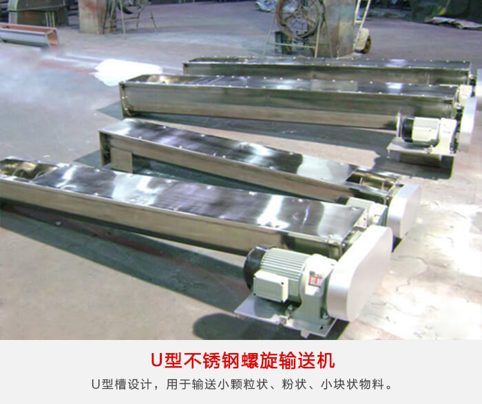 為U型槽設計,用於輸送小顆粒狀、粉狀、小塊狀物料。不適宜輸送易變質、黏性較大易結塊以及含水量較大的物料,每小時輸送量在9-134噸之間,U型不鏽鋼绿巨人黄色免费网站具有密封性好、承載轉距大、噪音低、不滲油等顯著特點。