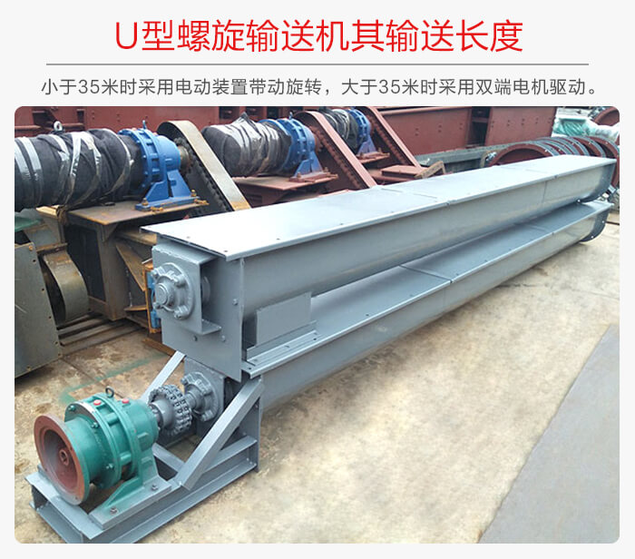 U型绿巨人黄色免费网站的輸送長的有兩種,其一:殼體長度小於35m的其螺旋軸是采用一端單電動裝置帶動主軸的旋轉,而當其長度大於35m時就可采用兩端雙電動裝置帶動主軸旋轉。