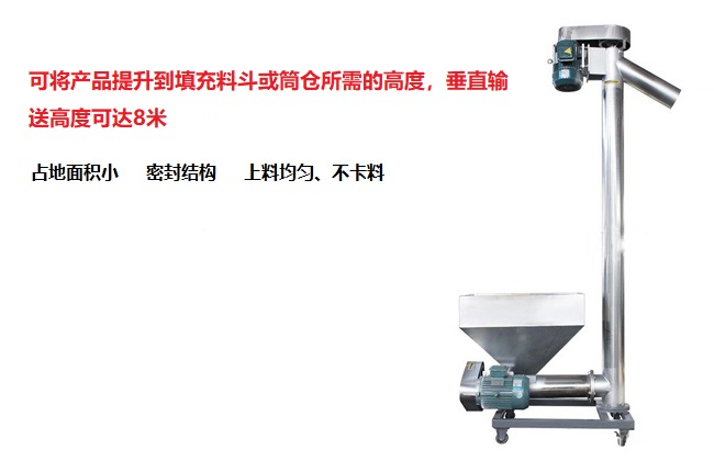 物料隨螺旋高速旋轉,被輸送的物料從水平部分的進料口加入,通過旋轉的水平進料螺杆送入輸送機和垂直部分,然後將物料向上推至出料口出料口由垂直螺杆,物料隨螺杆高速旋轉,被輸送的物料從水平部分的進料口加入,通過旋轉的水平進料螺杆進入輸送機,然後用垂直螺旋將物料推到出料口排出。