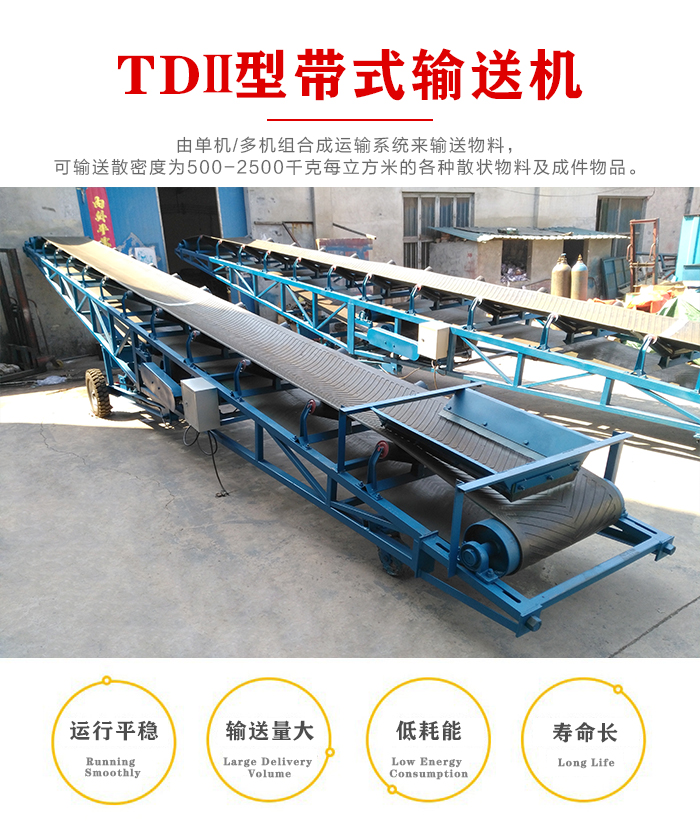TDII型帶式輸送機式通過型係列產品,是將原來TD75型機、DX型兩大係列(即通用型和高強度型)統一,更新換代的新產品,可廣泛用於冶金、礦山、煤炭、港口、電站、建材、化工、輕工、石油等各個行業。由單機多機組合成運輸係統來輸送物料,可輸送散密度為500-2500KG/M3的各種散狀物料及成件物品。