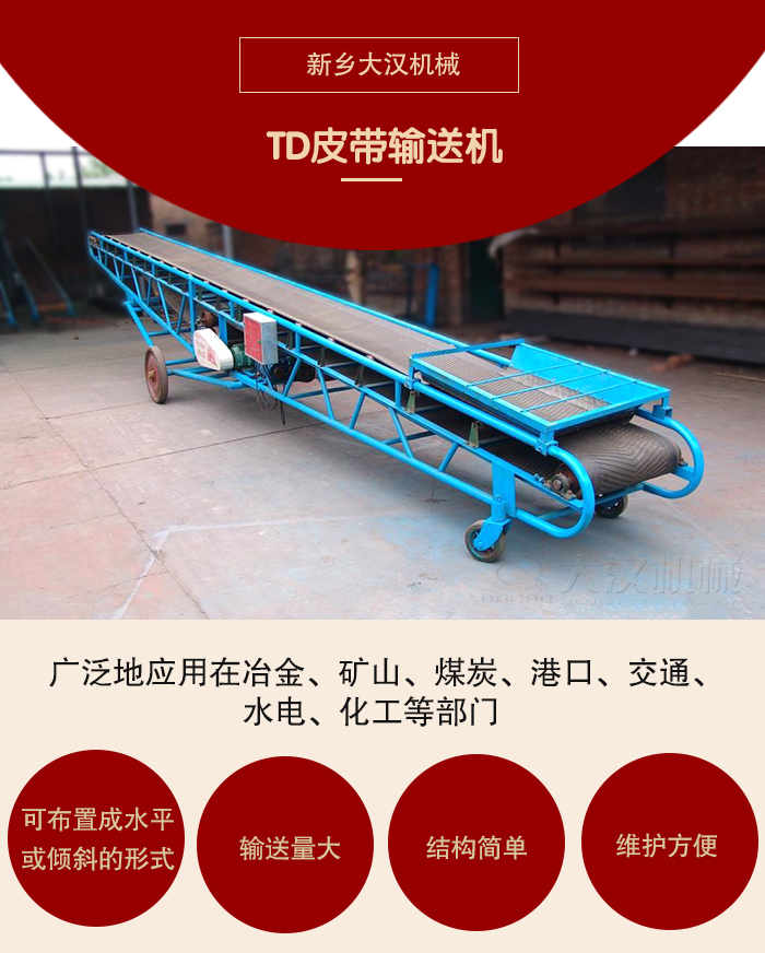 DTⅡ、TD75型皮帶由於輸送量大,結構簡單,維護方便,成本低,通用性強等優點,而被廣泛地應用在冶金、礦山、煤炭、港口、交通、水電、化工等部門,進行裝車、裝船、轉載或堆積各種常溫狀態的鬆散密度為500~2500kg/m3各種散狀物料或成件物品。由單機或多機組合成運輸係統來輸送物料,根據工藝要求可布置成水平或傾斜的形式,DTⅡ型皮帶輸送機除了可滿足水平或傾斜輸送要求外,還可采用帶凸弧段、凹弧段與直線段組合的輸送形式。輸送機允許輸送的物料塊度取決於帶寬、帶速、槽角和傾角,也取決於大塊物料出現的頻率。該輸送機適用的工作環境溫度一般為-25~+40℃。我公司還生產輕型皮帶輸送機和移動式輸送機。