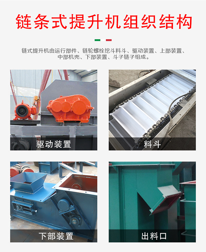 鏈條式提升機由運行部件、鏈輪螺栓挖鬥料鬥、驅動裝置、上部裝置、中部機殼、下部裝置、鬥子鏈子組成。