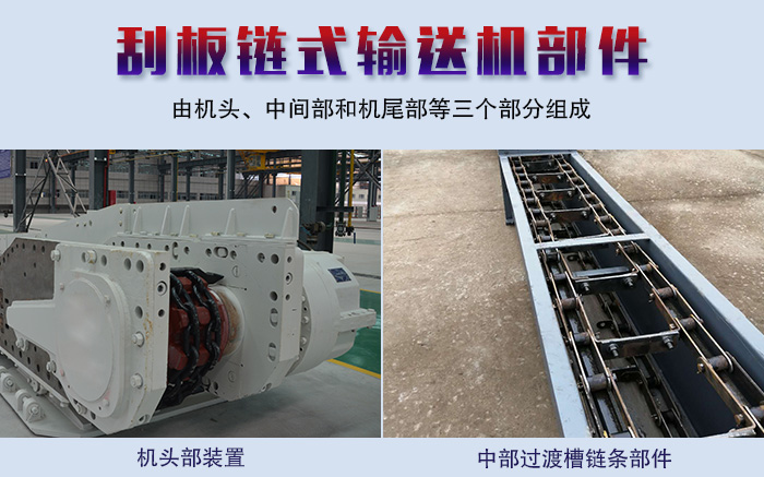 各種類型的刮板鏈式輸送機的主要結構和組成的部件基本是相同的,它由機頭、中間部和機尾部等三個部分組成。此外,還有供推移輸送機用的液壓千斤頂裝置和緊鏈時用的緊鏈器等附屬部件。機頭部由機頭架、電動機、液力偶合器、減速器及鏈輪等件組成。中部由過渡槽、中部槽、鏈條和刮板等件組成。機尾部是供刮板鏈返回的裝置。重型刮板輸送機的機尾與機頭一樣,也設有動力傳動裝置,從安設的位置來區分叫上機頭與下機頭。