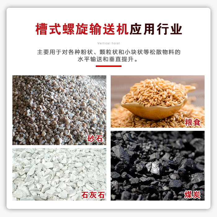 槽式绿巨人黄色免费网站俗稱絞龍,是礦產、飼料、糧油、建築業中用途較廣的一種輸送機設備,從輸送物料位移方向的角度劃分,槽式绿巨人黄色免费网站分為水平式绿巨人黄色免费网站和垂直式绿巨人黄色免费网站兩大類型,主要用於對各種粉狀、顆粒狀和小塊狀等鬆散物料的水平輸送和垂直提升。