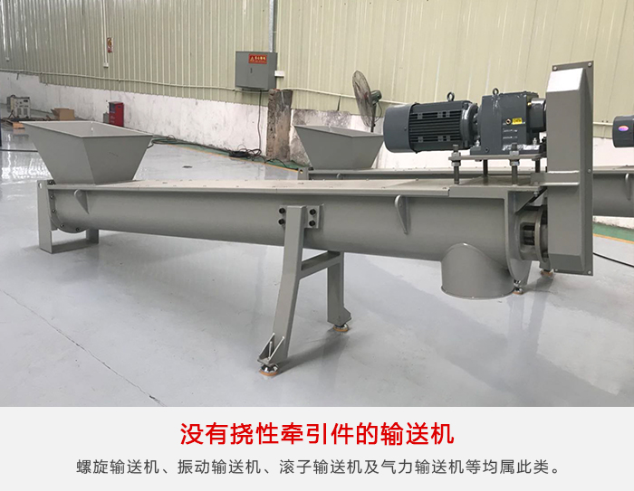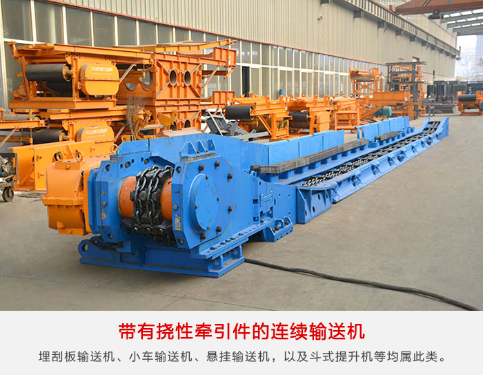 帶式輸送機、鏈板輸送機、刮板輸送機、埋刮板輸送機、小車輸送機、懸掛輸送機,以及鬥式提升機等均屬此類。其工作特點是把物品置於承載件上,由撓性牽引件搬運承載件沿著固定的線路運動,靠物品和承載件的摩擦力使物品與牽引件在工作區段上一起移動。