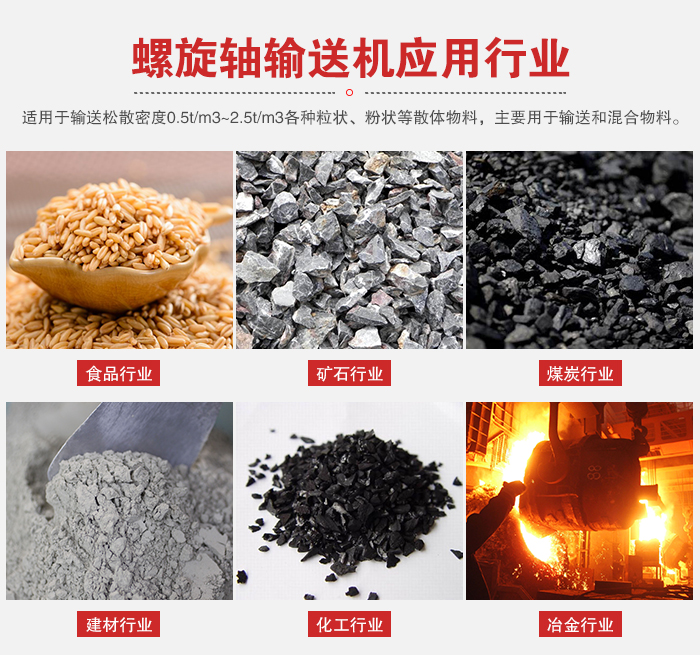 螺旋軸輸送機適用於輸送鬆散密度0.5t/m3~2.5t/m3各種粒狀、粉狀等散體物料,也可輸送成件物品。在混凝土攪拌站、穩定土拌合站使用較為廣泛,主要用於輸送混凝土集料水泥及摻合料。