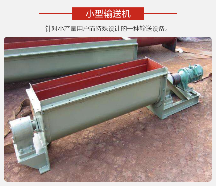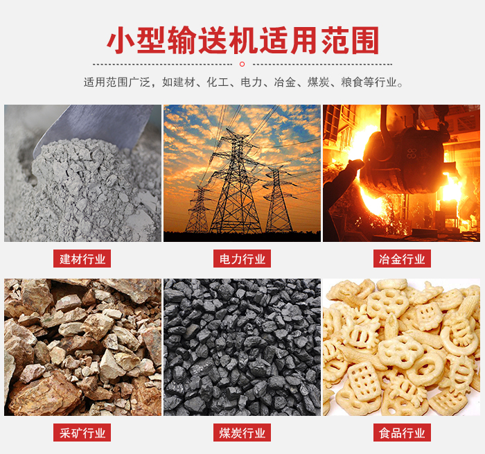 小型輸送機適用範圍廣泛,如建材、化工、電力、冶金、煤炭、糧食等行業,適用於水平或傾斜輸送粉狀、粒狀和小塊狀物料,如煤、灰、渣、水泥、糧食等。