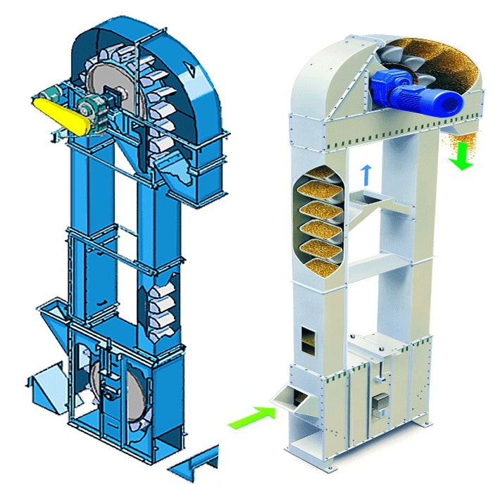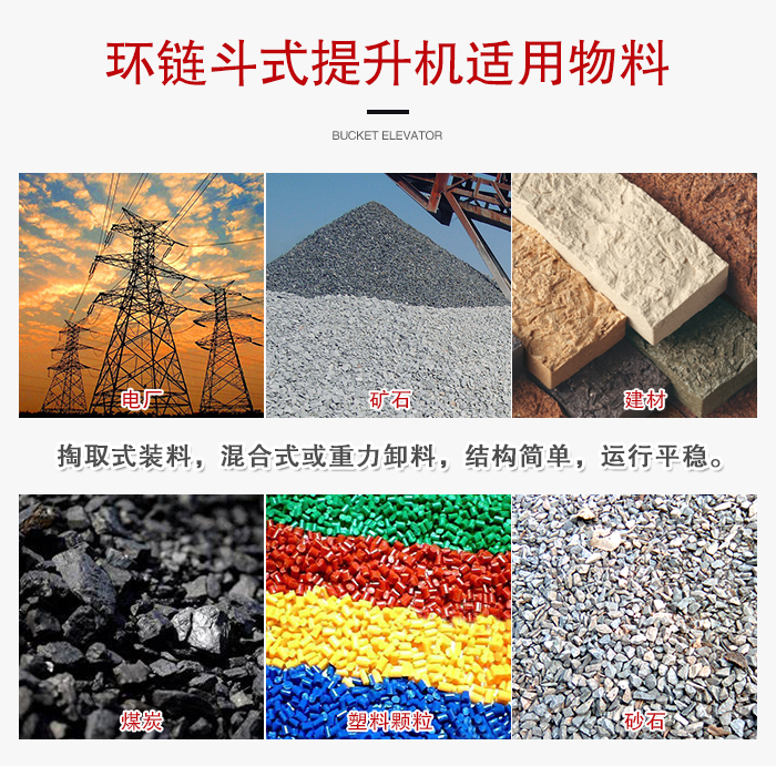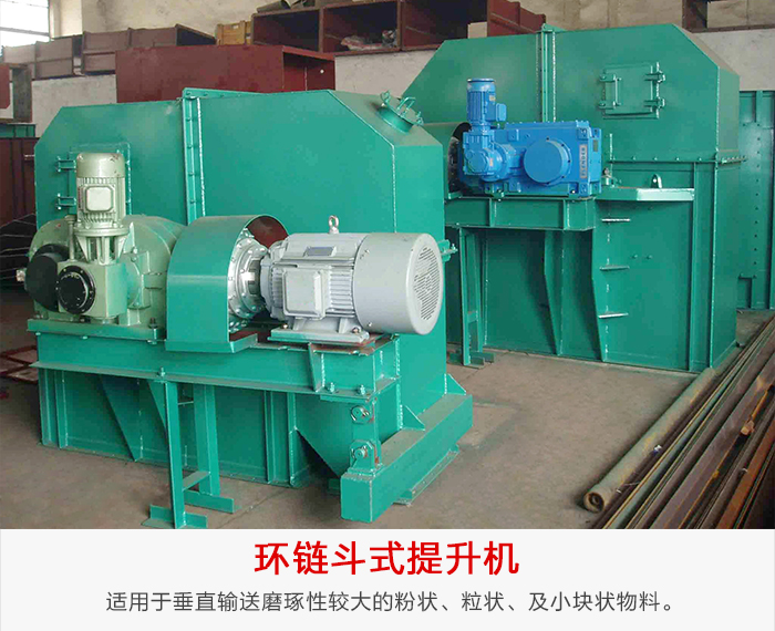 環鏈鬥式提升機適用於垂直輸送磨琢性較大的粉狀、粒狀、及小塊狀物料,如糧食、煤、水泥、碎礦石等,輸送高度不超過40m,其特點為,結構簡單,運行平穩,掏取式裝料,混合式或重力卸料,輪緣采用組合鏈輪,更換方便,鏈輪輪緣經特殊處理壽命長,下部如采用重力自動張緊裝置,能保持恒定的張力,避免打滑或脫鏈,同時在料鬥遇阻時,有一定的容讓性能夠有效地保護運動部件,物料溫度不超過250℃。