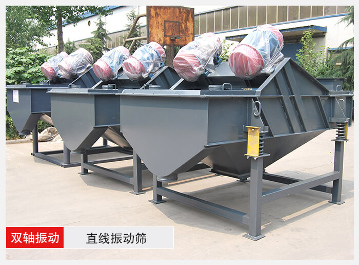 雙軸振動篩是利用同步異向回轉的雙不平衡重激振,篩麵水平或緩傾斜,篩箱的運動軌跡為直線。